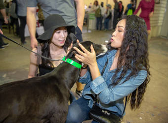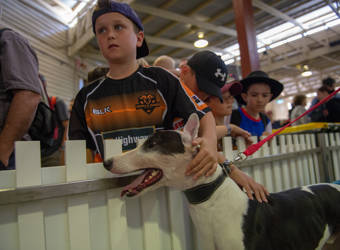 About 40 greyhounds and handlers participated in the event, which aims to give showgoers a glimpse into how greyhounds are cared for post-racing.