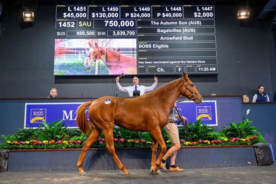 A beautifully related daughter of The Autumn Sun topped day one of the 2023 Magic Millions National Yearling Sale when selling for a record $750,000 on the Gold Coast.
