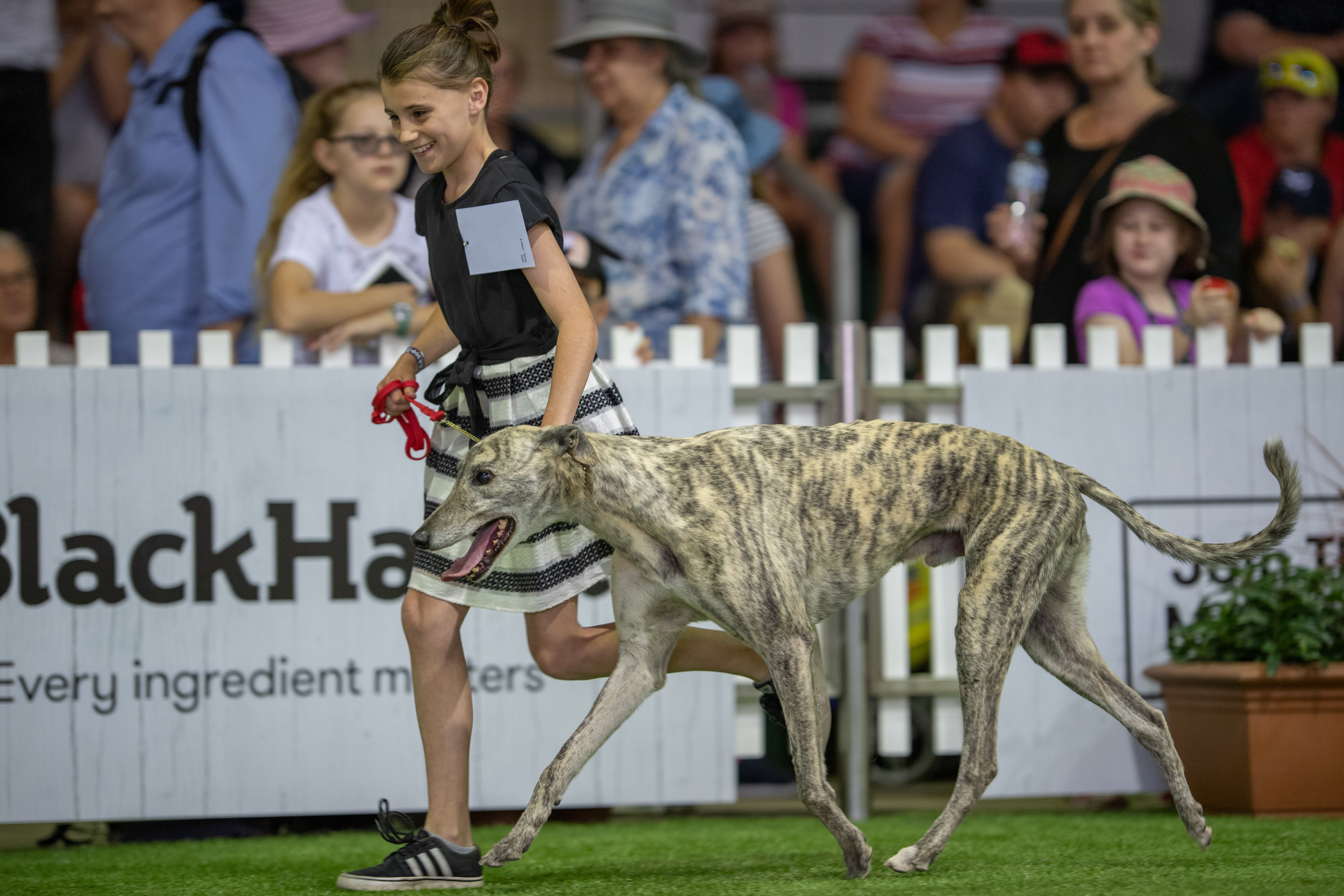 About 40 greyhounds and handlers participated in the event, which aims to give showgoers a glimpse into how greyhounds are cared for post-racing.